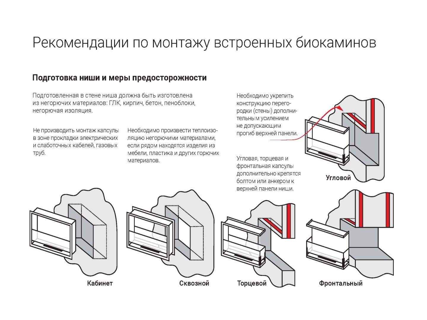 Встраиваемые варианты разделяются на такие как классические, устанавливаемые в подготовленное отверстие в стене или нише. Угловые, которые монтируются в угловую часть стены. Торцевые – открытые с трёх сторон. И сквозные, вид живого огня которых доступен в разных комнатах.