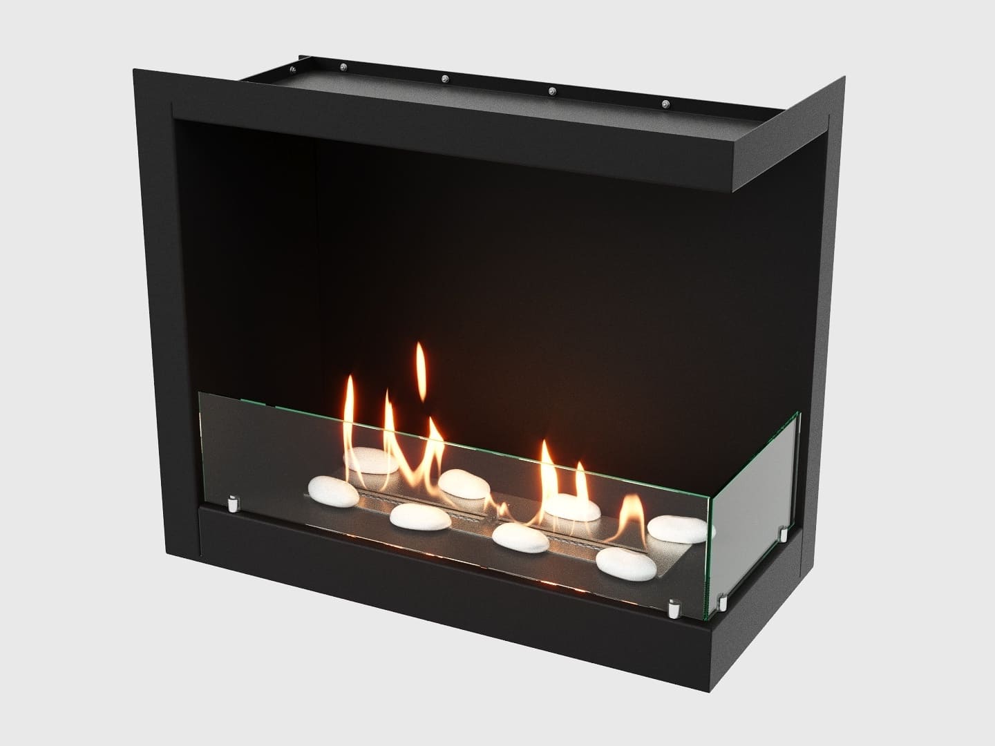 Очаг – это емкость куда заливается жидкое топливо. Емкость внутри заполняется керамическим материалом, который впитывает биотопливо, и в случае опрокидывания камина топливо не разливается. За счет этого конструкция стала полностью пожаробезопасной. Очаг встраивается в корпус из стали, который окрашивается специальной термостойкой краской, или же в заранее подготовленную нишу, изготовленную из негорючих материалов.