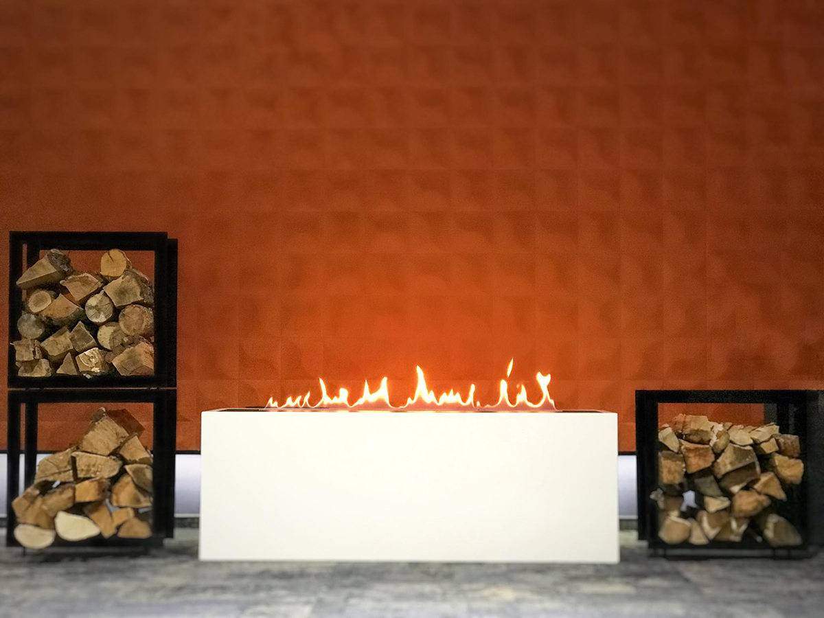 Очаг – это емкость куда заливается жидкое топливо. Емкость внутри заполняется керамическим материалом, который впитывает биотопливо, и в случае опрокидывания камина топливо не разливается. За счет этого конструкция стала полностью пожаробезопасной. Очаг встраивается в корпус из стали, который окрашивается специальной термостойкой краской, или же в заранее подготовленную нишу, изготовленную из негорючих материалов.