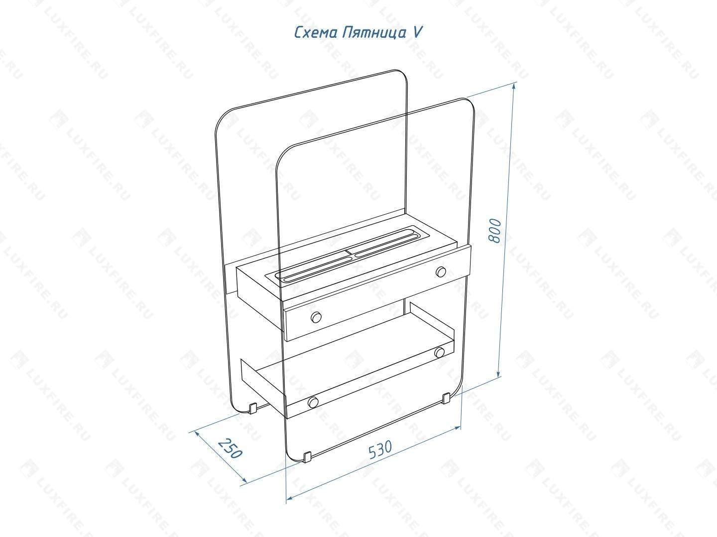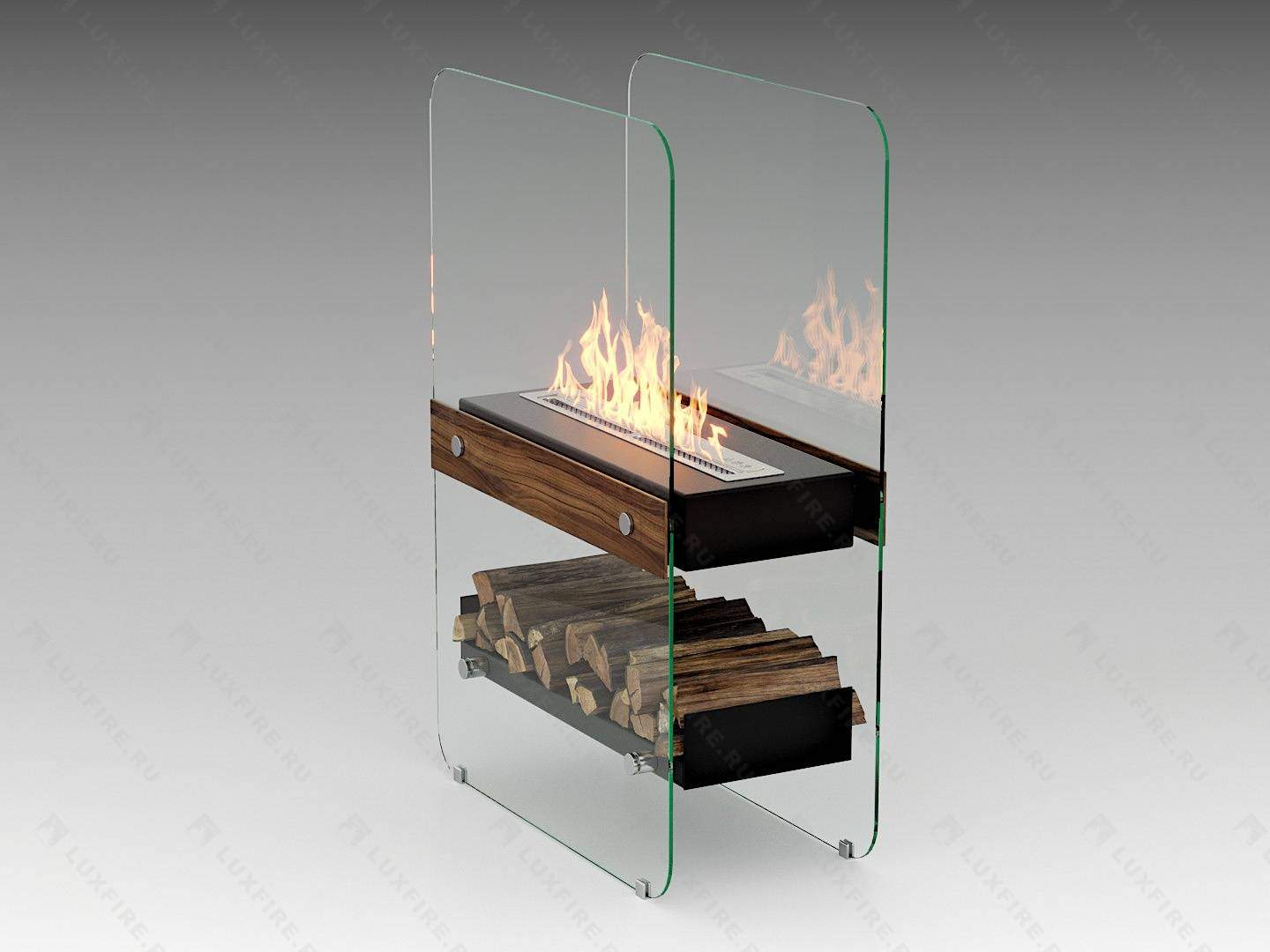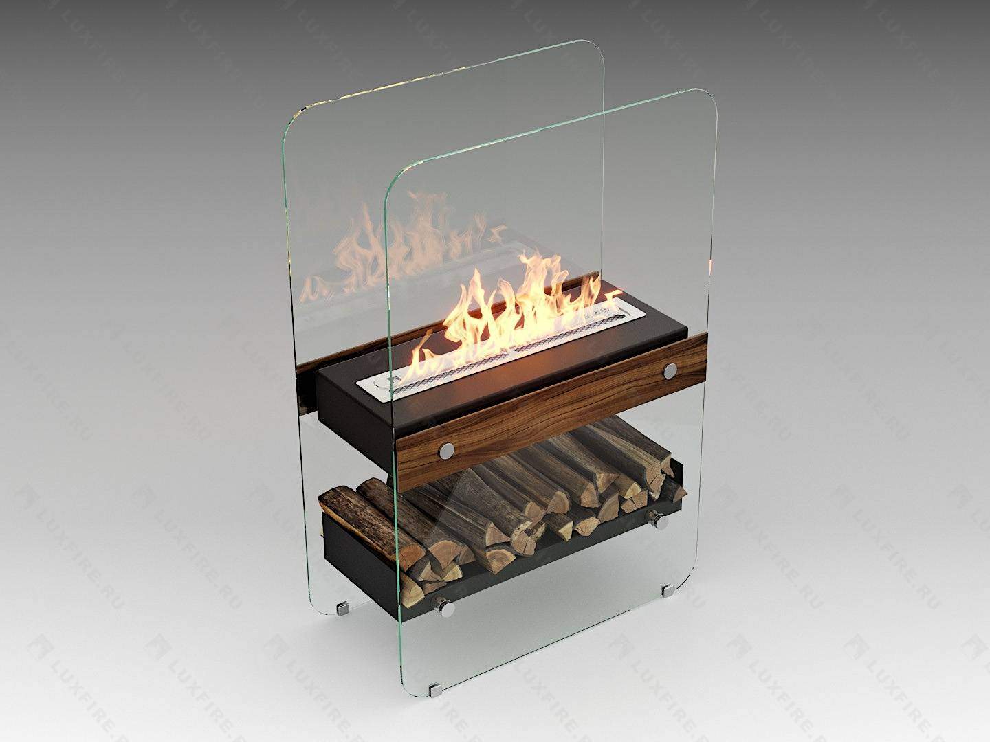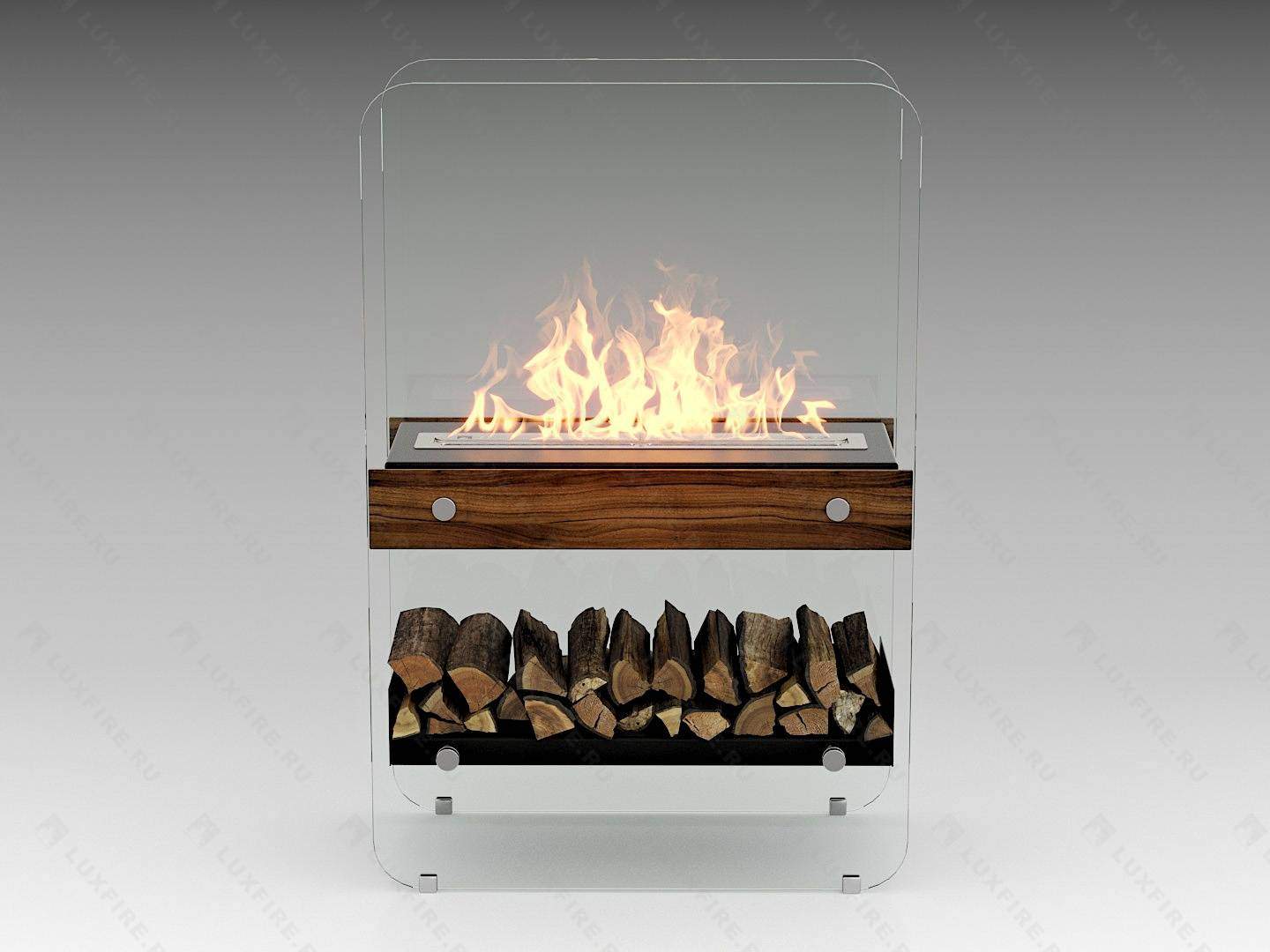 Представляет собой сборную модель оригинального авторского дизайна студии "Vontaren&Grinero" из закаленного прозрачного стекла и топливного блока Luxfire 450 XS на подиуме, закрепленного на 8 дистанционных держателях. С деревянными натуральными накладками и набором дров с дровницей, обработанных огнебиозащитным средством.