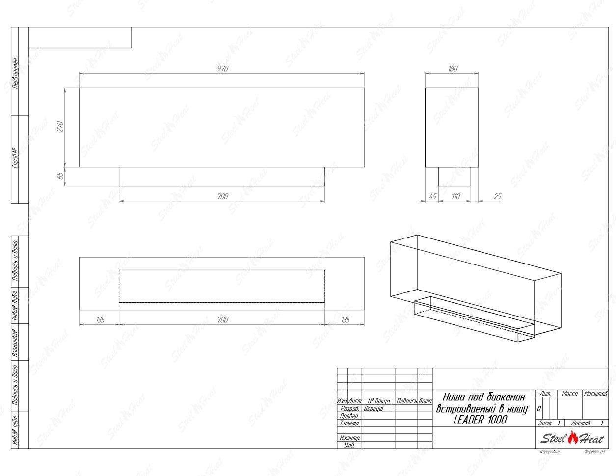 Встраиваемый Биокамин SteelHeat LEADER-SH 1000 предназначен для встраивания в глухие ниши из гипсокартона, кирпича, пеноблоков, бетона.