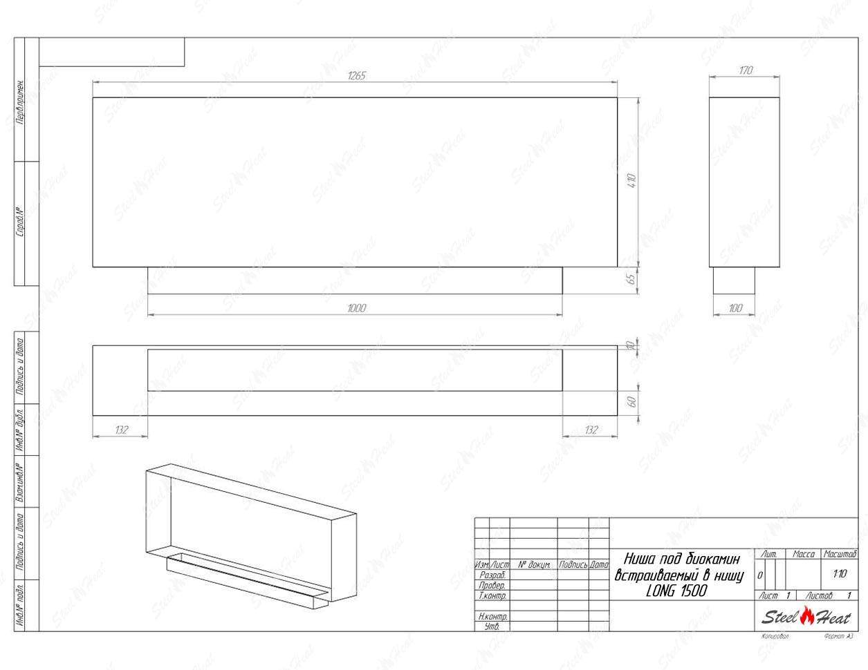 Встраиваемый Биокамин SteelHeat LONG 1500 предназначен для встраивания в глухие ниши из гипсокартона, кирпича, пеноблоков, бетона.