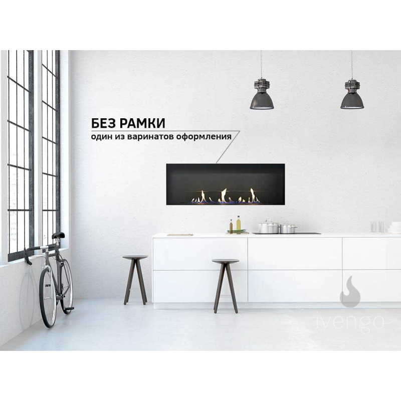 Встраиваемый биокамин Ivengo SLim – одна из наиболее популярных моделей.Благодаря тому, что горелка «спрятана» под днищем, очаг имеет небольшую высоту. Компактная, вытянутая по горизонтали, конструкция не будет визуально «опускать» потолок, как это нередко случается с крупноразмерными экокаминами.