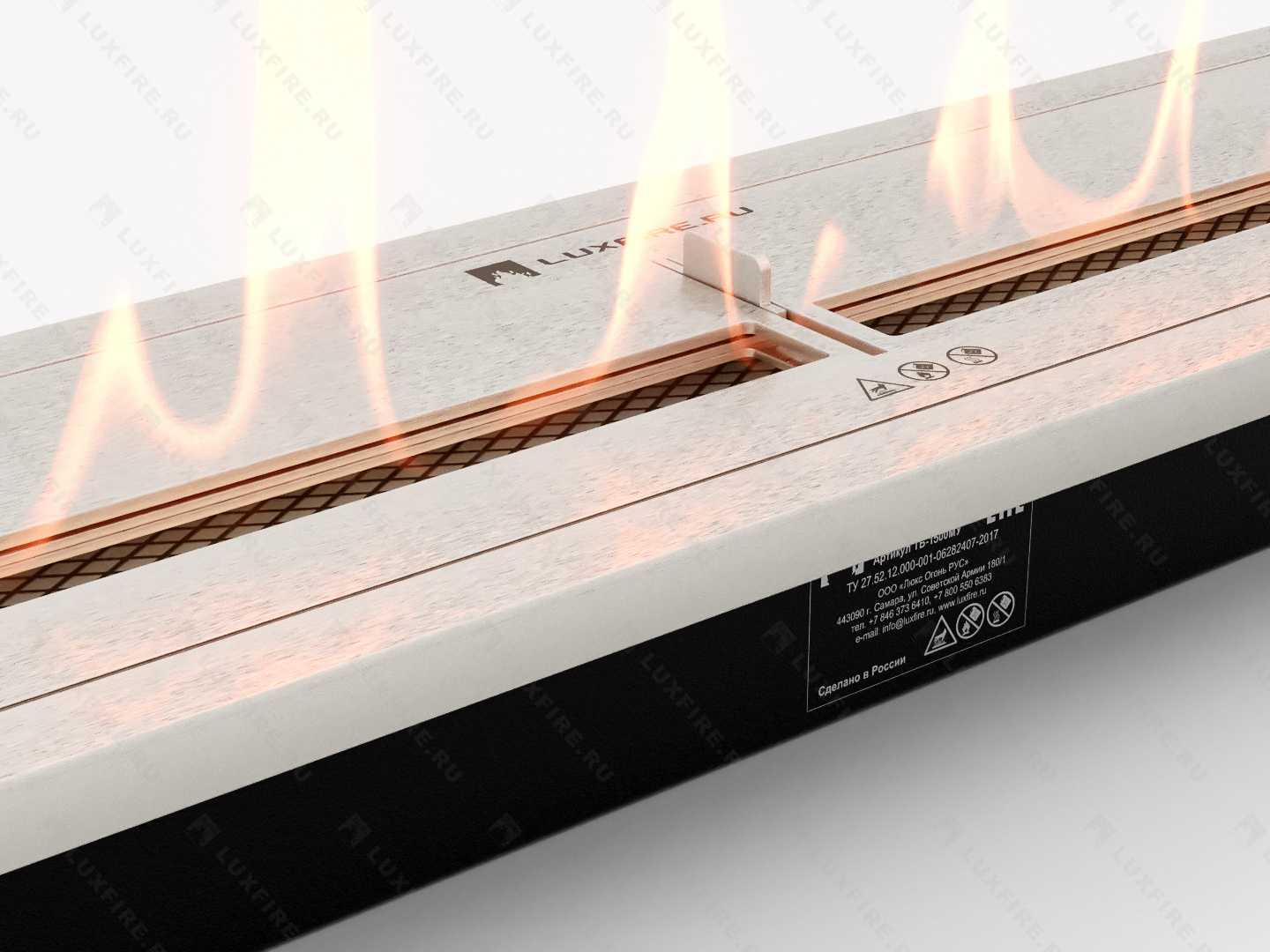 Блок оснащен встроенным пламегасителем, при этом удобно декорировать топливный блок керамическими дровами, они не создают препятствия ходу задвижки.