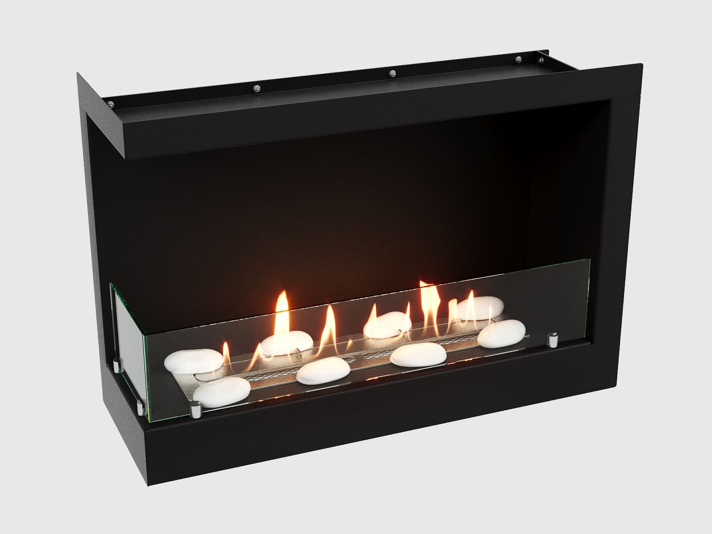 Очаг – это емкость куда заливается жидкое топливо. Емкость внутри заполняется керамическим материалом, который впитывает биотопливо, и в случае опрокидывания камина топливо не разливается. За счет этого конструкция стала полностью пожаробезопасной. Очаг встраивается в корпус из стали, который окрашивается специальной термостойкой краской, или же в заранее подготовленную нишу, изготовленную из негорючих материалов.