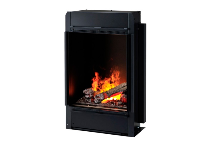 Дрова, охваченные огнем, прекрасно дополняет дизайн камина. Узкий вытянутый корпус черного цвета смотрится элегантно и подчеркивает красоту безудержного ярко-оранжевого пламени.
