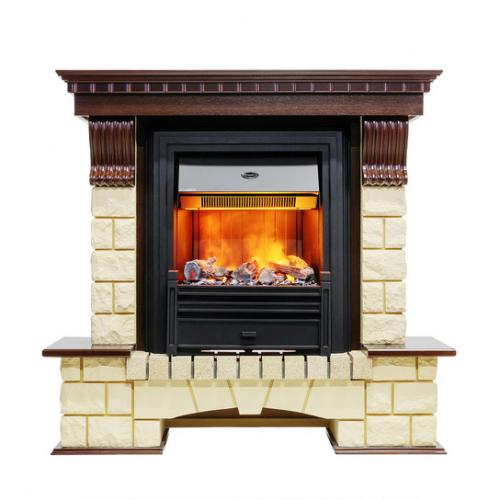 Портал комплекта выполнен с использованием искусственного камня, а декоративные элементы изготовлены из МДФ. Искусственный камень состоит преимущественно из полимерной смолы, в которую добавлена натуральная каменная крошка. Также в состав вводится краситель, благодаря чему камень приобретает цвет шампань. После схватывания материала он подвергается механической обработке для придания максимального сходства с камнем. После этого он оформляется расшивкой под кирпич. Основным преимуществом искусственного камня перед натуральным является значительно меньший вес. Это влияет на снижение массы готового камина. Декоративные элементы, выполненные из МДФ, покрыты шпоном в цвете темного дуба. Такое покрытие выполняет не только декоративную функцию, но и дополнительно защищает основу от внешних негативных воздействий. В портале комплекта, выполненного в стиле кантри, четко выделяются зона очага и основание. Очаг обрамляют каменные стенки, на которые сверху установлена массивная каминная крышка. Для ее визуальной поддержки в конструкции предусмотрены изящные изогнутые консоли. Пространство непосредственно перед очагом также выложено камнем. Основание имеет форму арки, под свод которой для декора можно уложить настоящие Муляж дров. Сверху основание оформлено тонкими полочками, которые, как и крышку, можно украсить различными декоративными элементами.