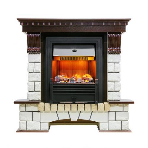 Угловой каминокомплект «Pierre Luxe» от производителя Dimplex оборудован очагом «Brookline Black» с инновационной системой имитации реалистичного пламени. В оформлении используется сочетание камня белого цвета с темным декором и очагом. При классической конструкции изделия такое сочетание выглядит современно и очень приятно для глаз. Несмотря на форму изделия и использование в его оформлении камня, выглядит оно совсем не массивно. Обусловлено это конструкцией углового элемента. Предлагаемый камин лучше всего подходит для оформления просторных помещений, оформленных в классическом стиле, где он без труда сможет занять свободный угол.